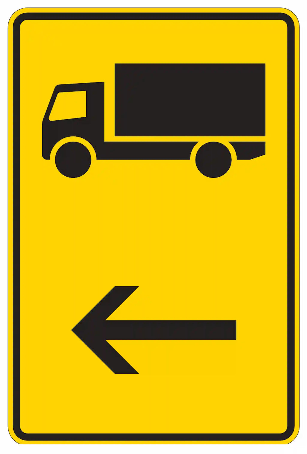 Setzen Sie auf das Verkehrszeichen VZ 422-10 "Wegweiser für KFZ über 3,5 t, hier links" – ein Richtzeichen, das für eine verlässliche Führung des Schwerverkehrs unerlässlich ist. Die deutliche Wegweisung unterstützt problemlose Umleitungen und sorgt so für einen reibungslosen Verkehrsfluss.